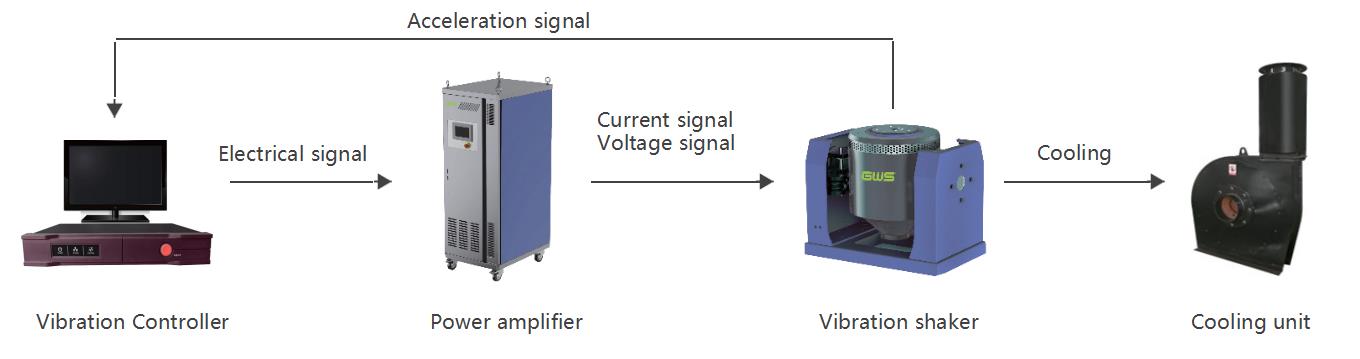 Un système de test de vibration électrodynamique est un système de contrôle en boucle fermée typique composé d’un agitateur de vibration, d’un amplificateur de puissance, d’un contrôleur de vibration, d’une unité de refroidissement et d’un instrument de mesure (par exemple : accéléromètre), etc.