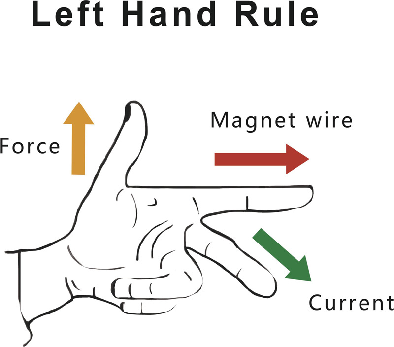 La force électromagnétique exercée sur un conducteur parcouru par un courant est proportionnelle à l’intensité du courant, à la longueur effective du conducteur dans le champ magnétique et à l’induction magnétique du champ magnétique à l’endroit où se trouve le conducteur. Autrement dit, F = BLI. Le sens de cette force est déterminé par la règle de la main gauche.