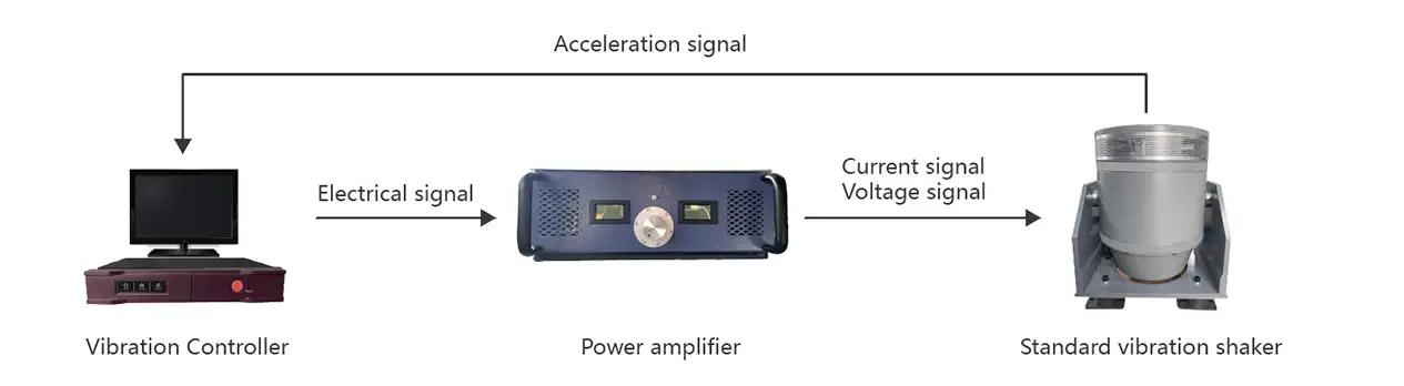 Le vibreur génère des vibrations ou des chocs en réponse à un signal de commande amplifié provenant du contrôleur. L’accéléromètre transmet le signal capté au contrôleur pour une correction en temps réel, puis le renvoie à l’amplificateur de puissance.